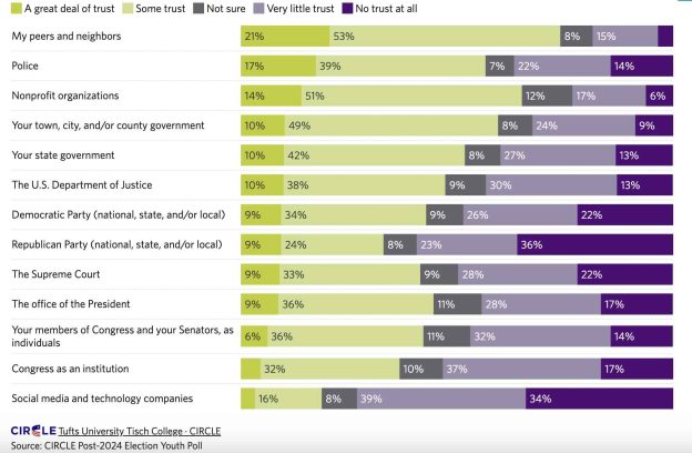 Whether people should trust these institutions is a different question that is worth some reflection. CIRCLE shows that higher trust is related to voter turnout, so one drawback of deep distrust can be disengagement.