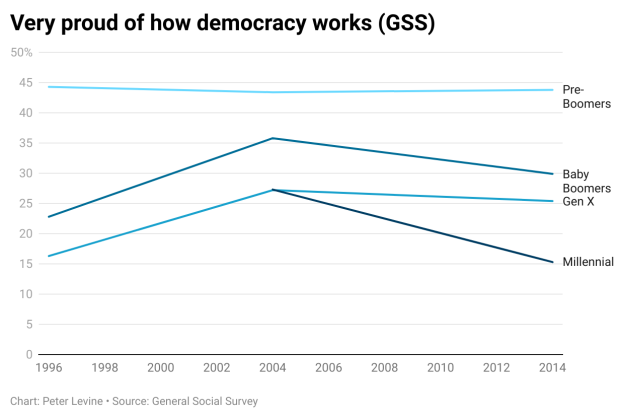 I am not sure how I would have answered that question at those times. I am committed to democracy but not necessarily “proud” of the way it functions in the USA. Nevertheless, the GSS trends show that today’s differences by age are fairly typical, and people change their views as they go through life and as history plays out.