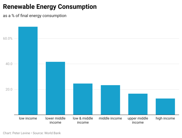 The World Bank’s 2022 data show that the countries that used the highest proportions of renewables were very poor, such as the DRC at 96.3% and Somalia at 95.4%. All of Sub-Saharan Africa used 70.3% renewables, and all of the world’s low-income countries used 69.2%–compared to 10.9% in the USA. (The Energy Institute puts the US share even lower, at 7.2%.)