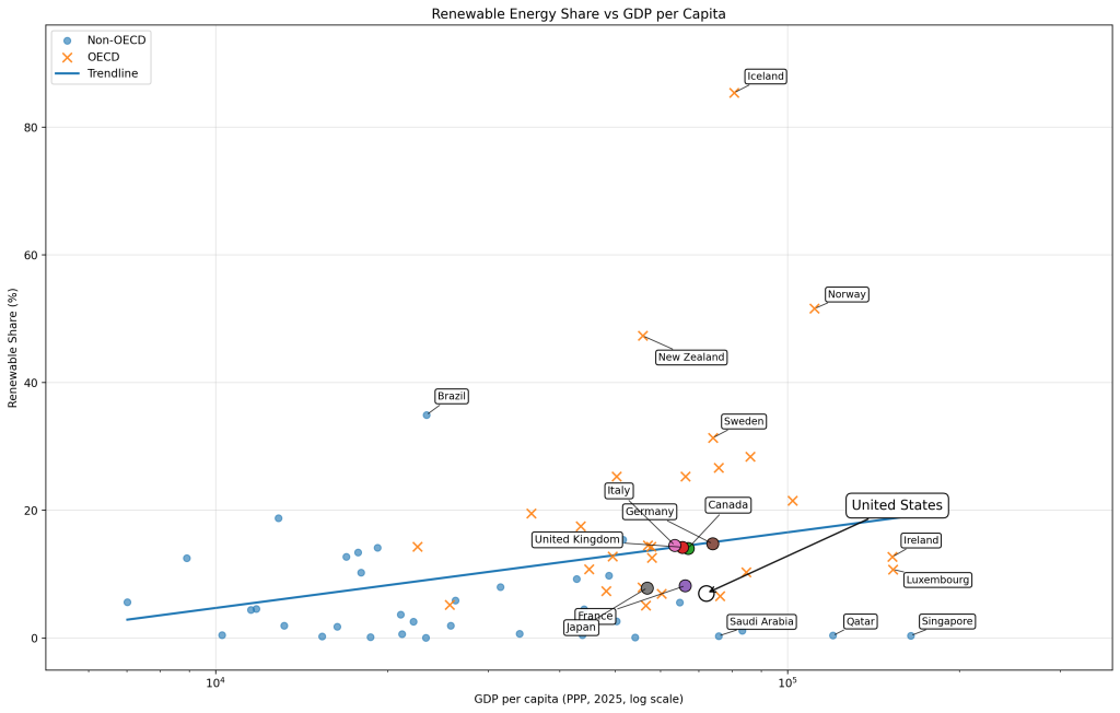 For 2024, I show the per capita income (from the IMF) and the share of renewable energy (from the Energy Institute) for each of 75 countries in 2024. The OECD countries–which are wealthier–are shown with x’s. Some outliers are labeled.